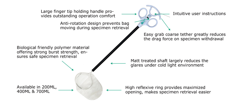 VHMED Black & White+Tether range of detachable endobags are featured with a strong polyurethane bag, a comfortably drawing tether and an ergonomically designed handle on a standard 10mm diameter shaft.The high memorable metal ring on the bag rim ensures the largest bag opening to facilitate easy specimen retrieval. The Black & White+Tether detachable endobags are available with four sizes: 100ML, 200ML, 400ML, 700ML.